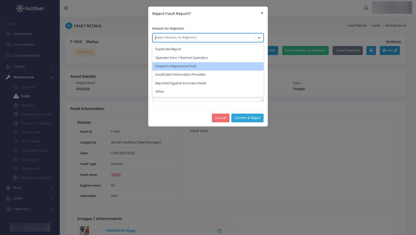 Reject a Fault when a reported issue is a duplicate, incorrect, or cannot be reproduced, keeping your fault management clean and efficient.